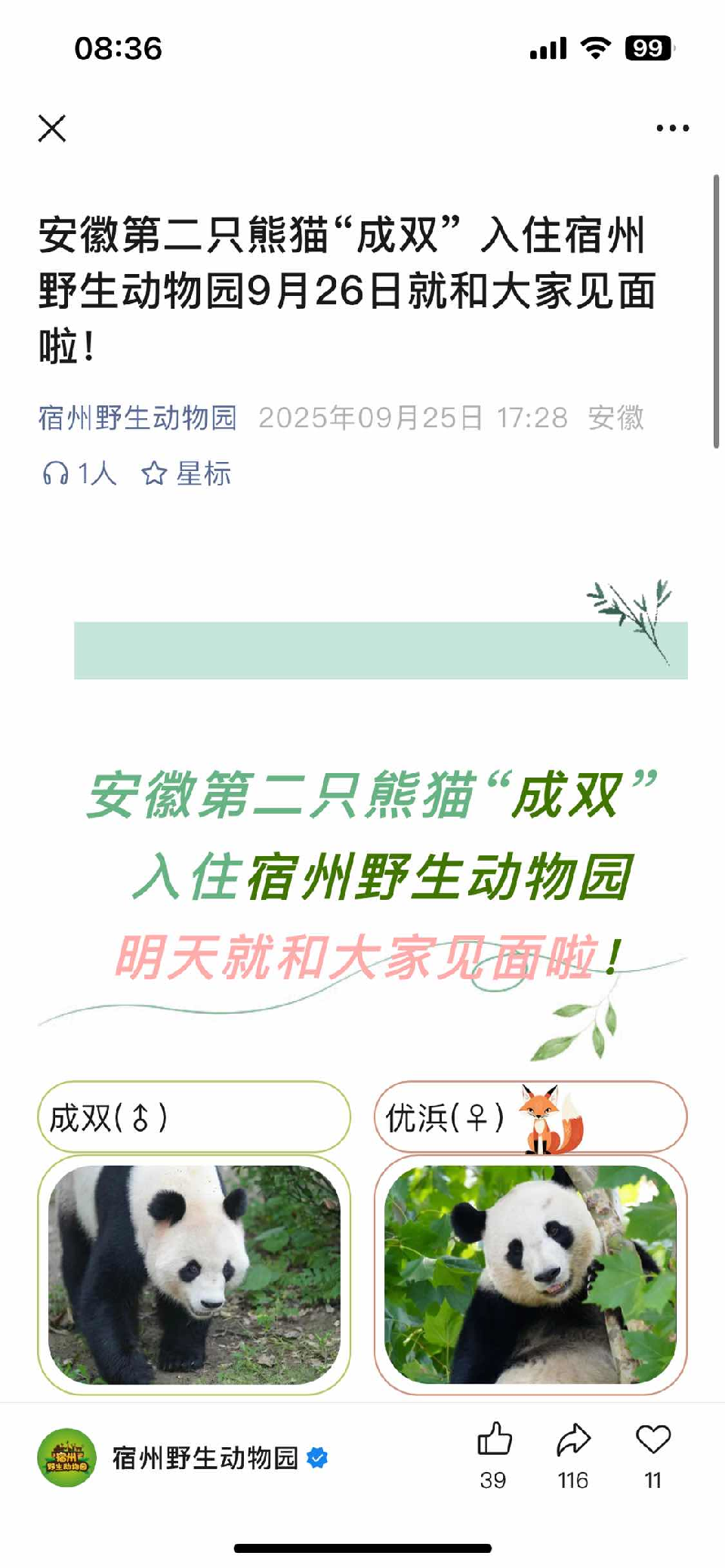 安徽第二只熊猫“成双” 入住宿州野生动物园9月26日就和大家见面啦!9月19日到宿州的吧?